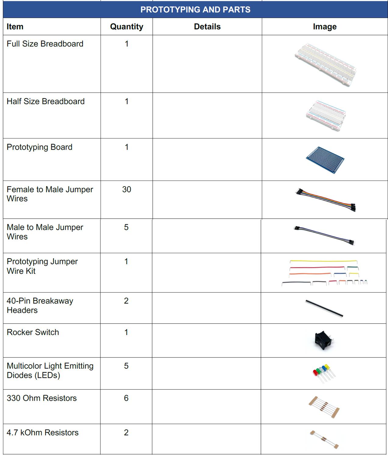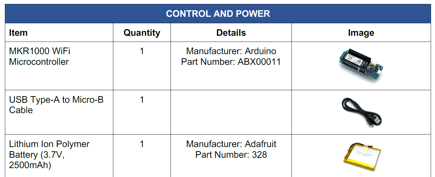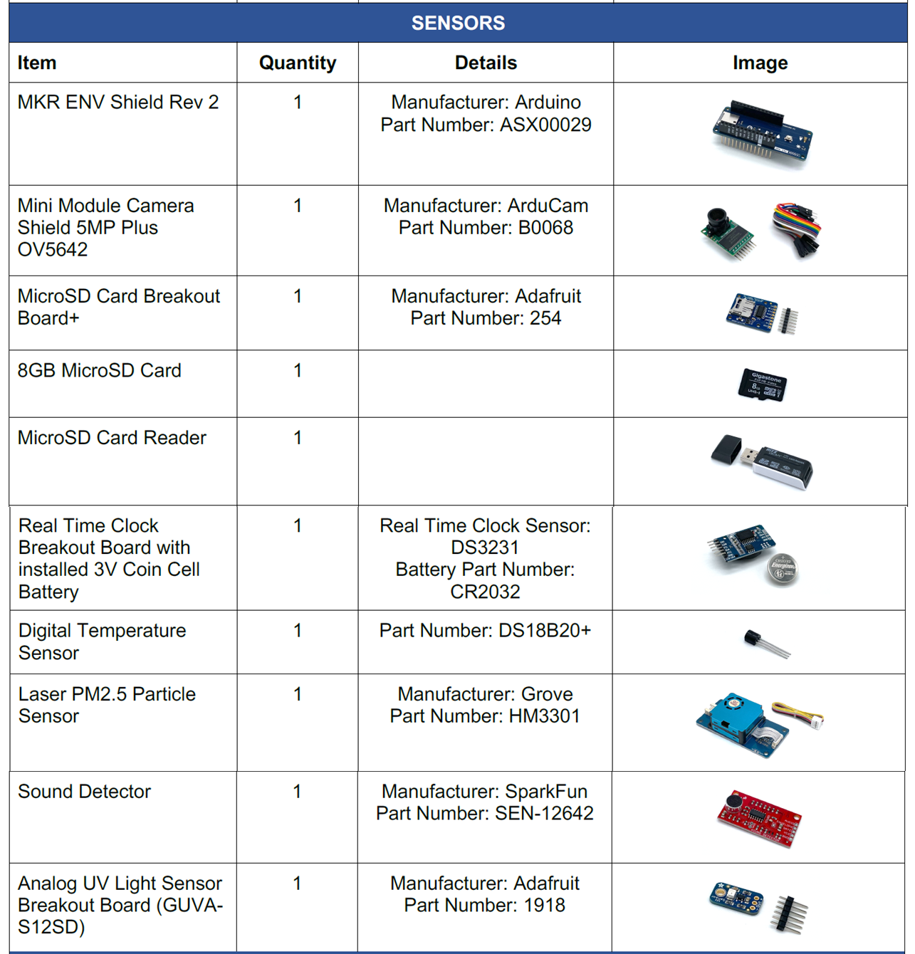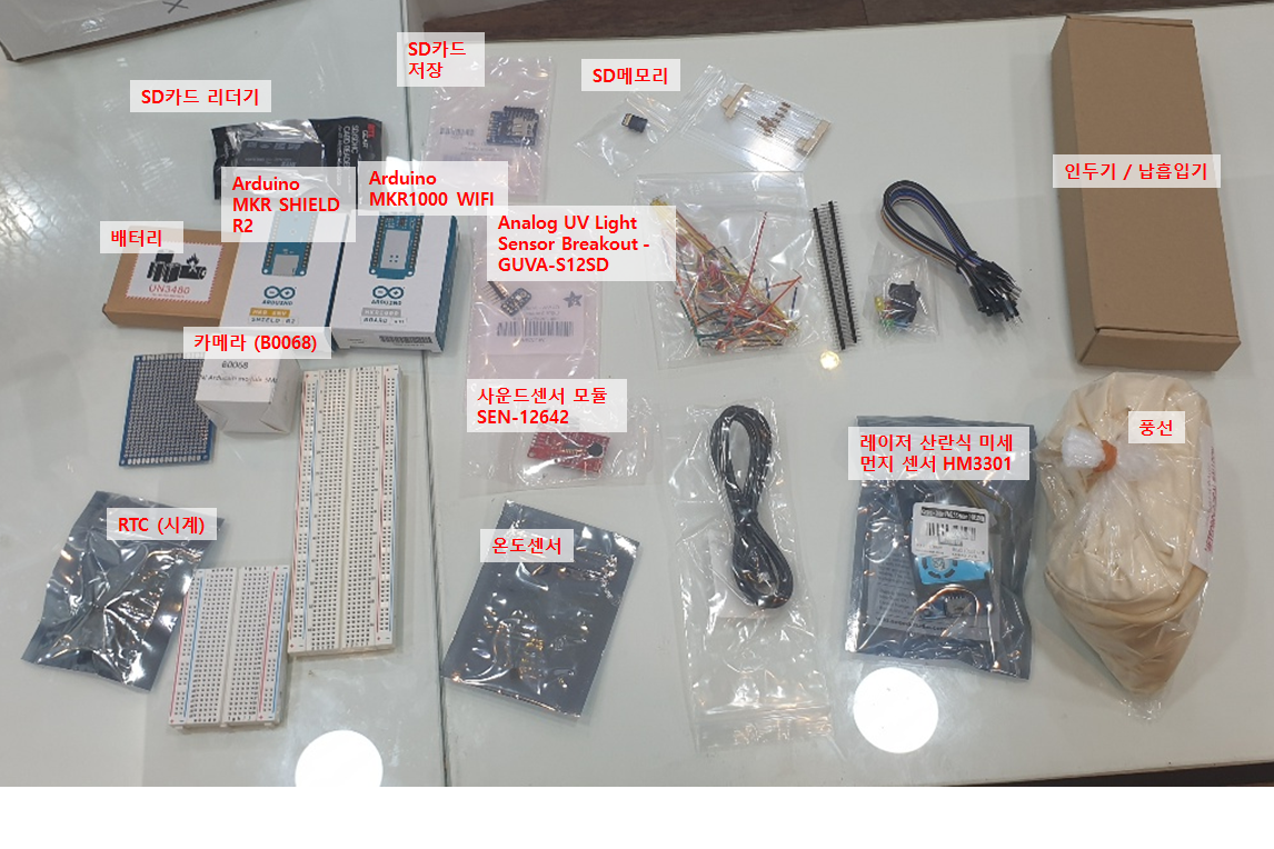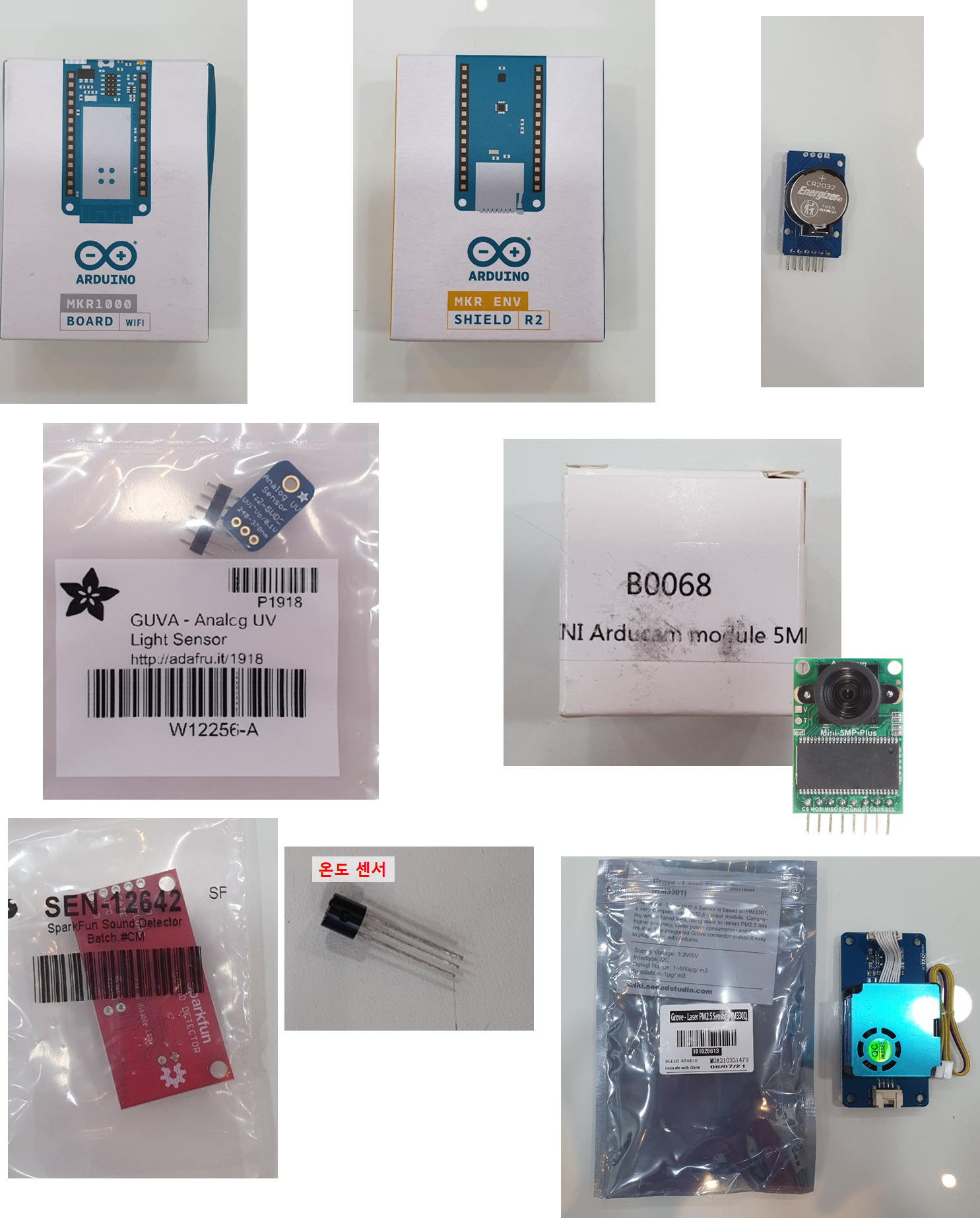 센서 구성요소: MKR ENV Shield Rev 2, Mini Module Camera Shield 5MP Plus OV5642, MicroSD 카드 브레이크아웃 보드+, 실시간 클록 브레이크아웃 보드, 디지털 온도 센서, 레이저 PM2.5 입자 센서, 소리 감지기 및 아날로그 UV 광 센서 브레이크아웃 보드(GUVA-S12SD).