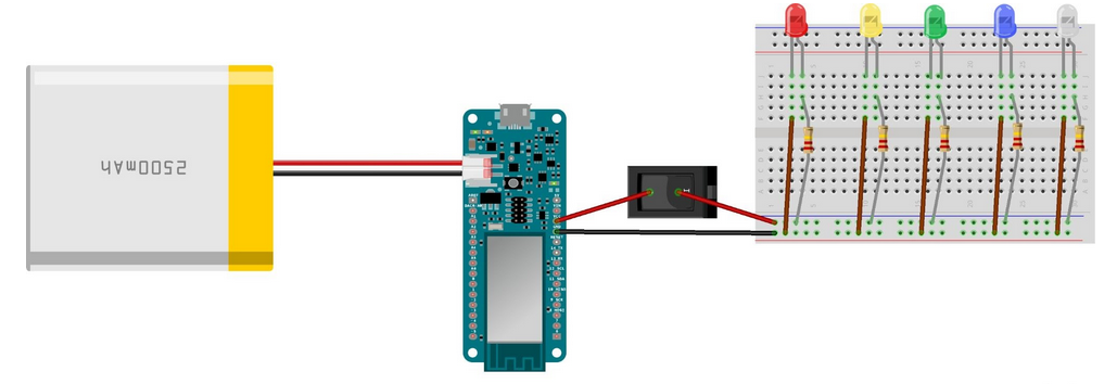 다음 다이어그램에서는 2개의 더 긴 빨간색 브레드보드 와이어를 사용하여 스위치 갈래의 구멍을 통해 스위치를 부착했다.