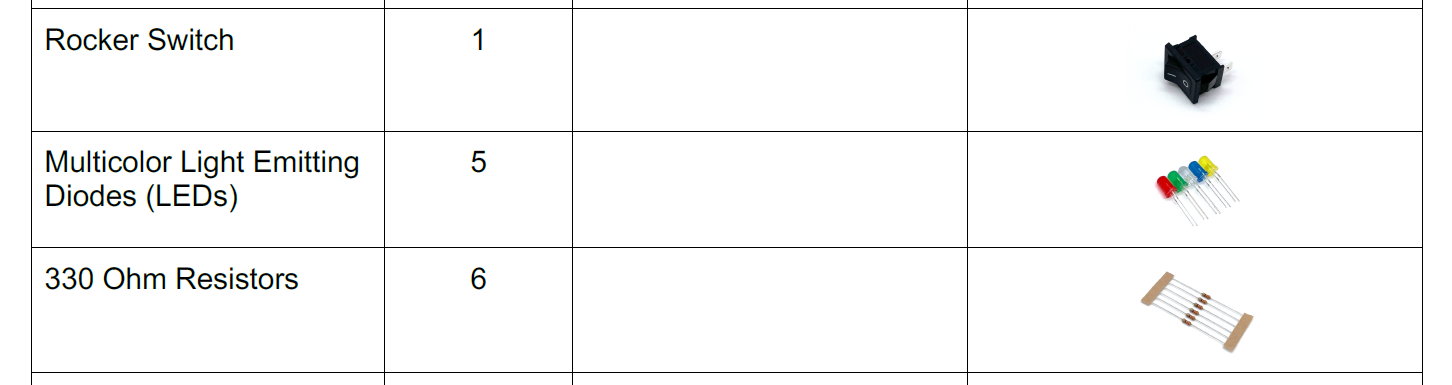 LED 부품은 다음과 같다. Rocker Switch와 led5개, 330 옴이 있다.