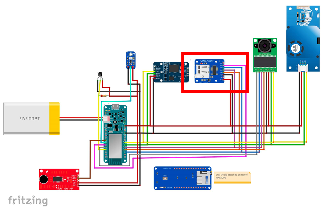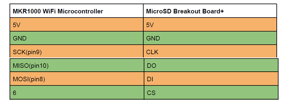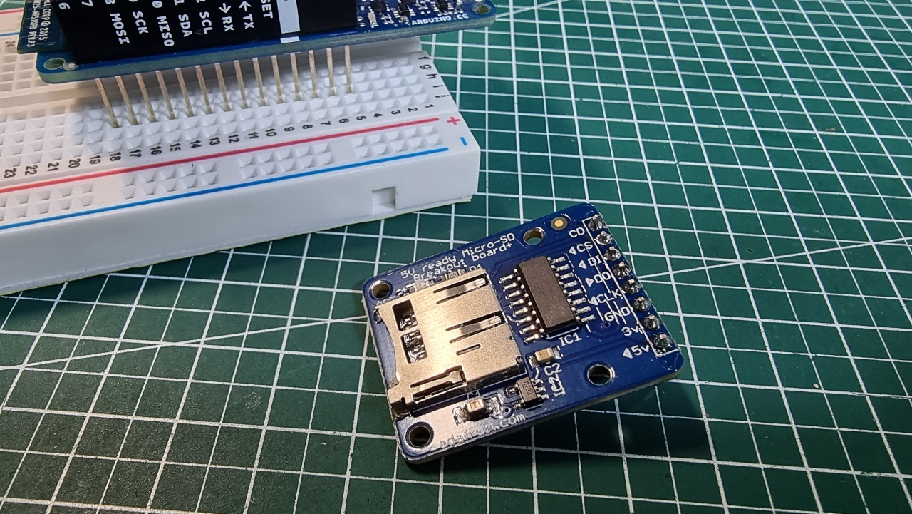 다음과 같이 MicroSD Card Breakout board를 연결할 수 있다. Arduino와 함께 사용하려면 GND 를 접지, 5V 에서 5V, CLK 를 핀 13, DO 를 핀 12, DI 를 핀 11, CS 를 핀 10에 연결한다.. 그런 다음 FAT 및 FAT32를 지원하는 Arduino IDE의 SD 라이브러리를 사용할 수 있다.