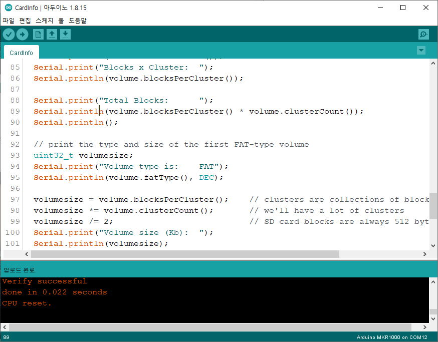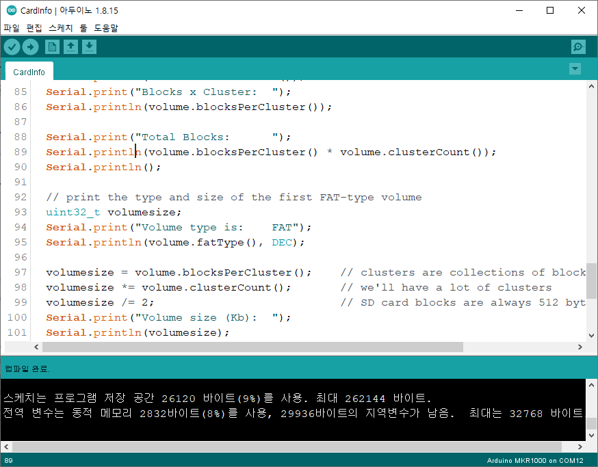 01. Arduino IDE에서 파일 -> 예제 -> SD -> CardInfo로 이동한다.