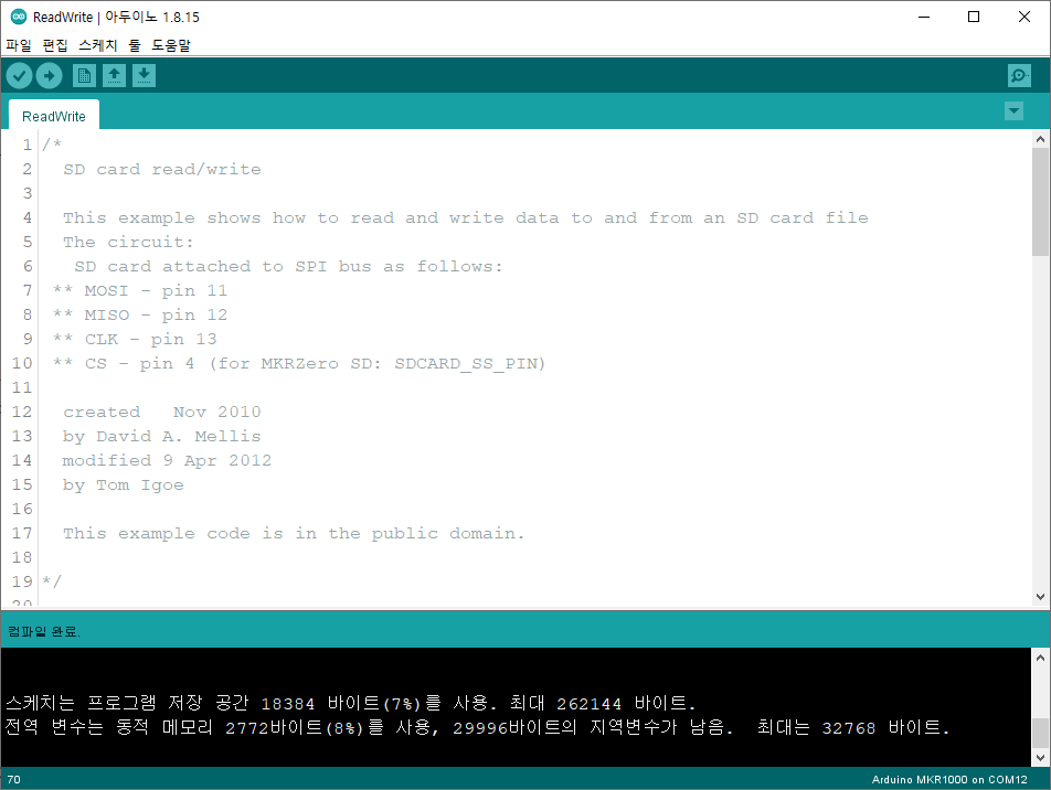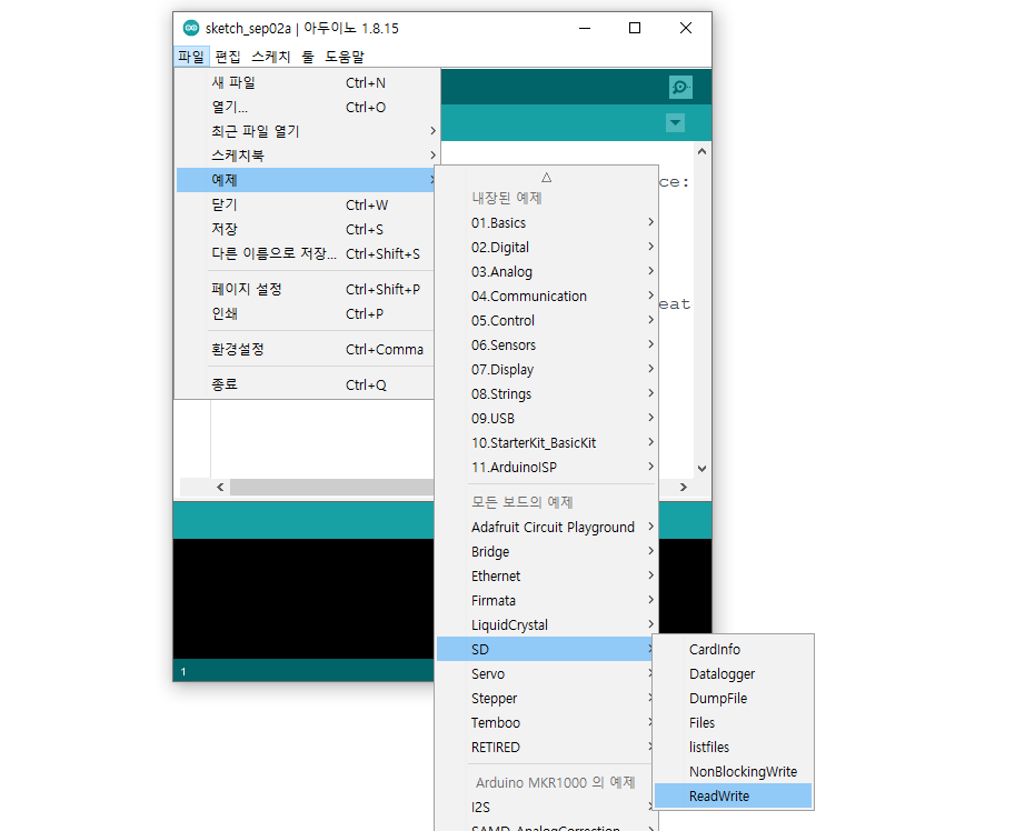 01. Arduino IDE에서 파일 -> 예제 -> SD -> ReadWrite로 이동한다.