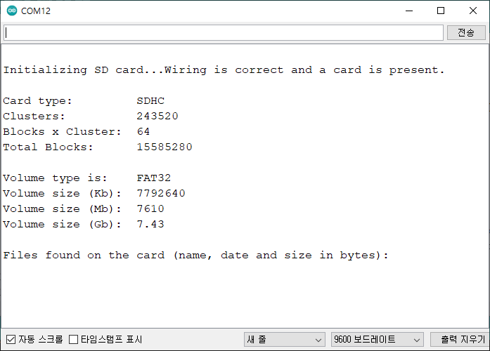 05. 프로그램을 업로드한 후 시리얼 모니터를 다시 확인한다. 카드가 올바르게 삽입되고 보드가 올바르게 배선되면 카드에 대한 정보가 표시된다.
