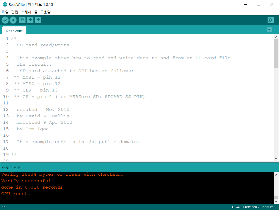 01. Arduino IDE에서 파일 -> 예제 -> SD -> ReadWrite로 이동한다.