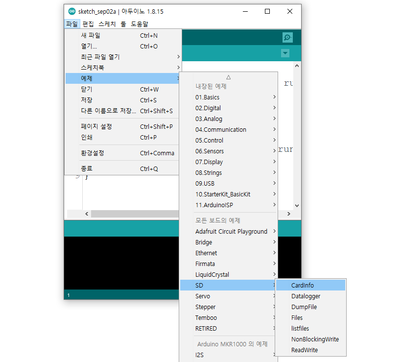 01. Arduino IDE에서 파일 -> 예제 -> SD -> CardInfo로 이동한다.
