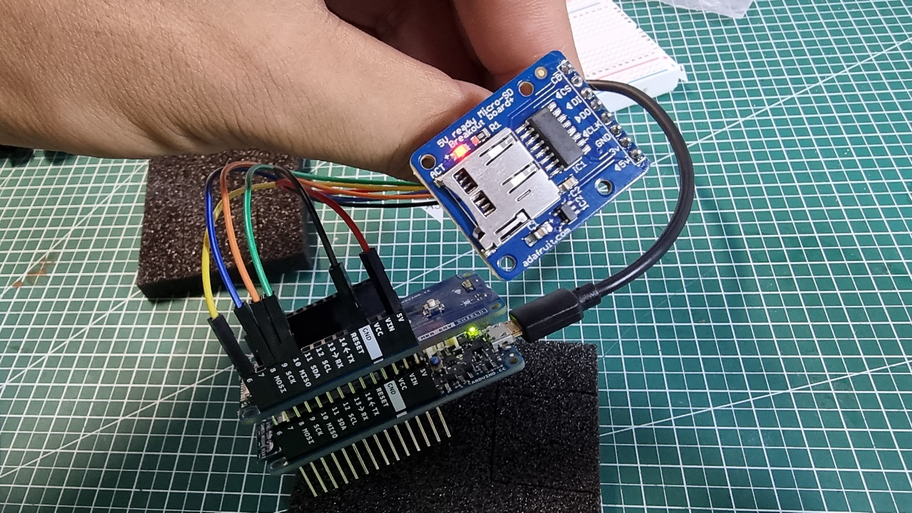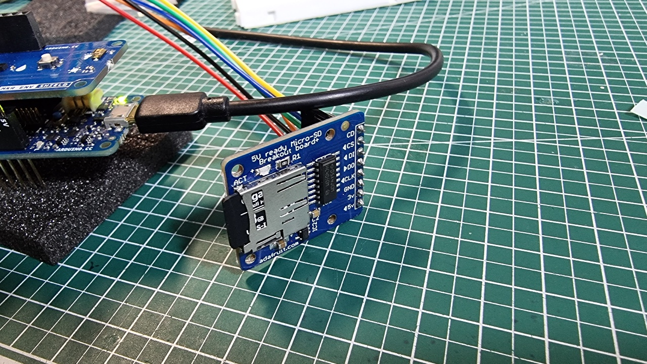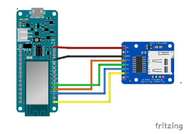 다음과 같이 MicroSD Card Breakout board를 연결할 수 있다.  Arduino와 함께 사용하려면 GND 를 접지, 5V 에서 5V, CLK 를 핀 13, DO 를 핀 12, DI 를 핀 11, CS 를 핀 10에 연결한다.. 그런 다음 FAT 및 FAT32를 지원하는 Arduino IDE의 SD 라이브러리를 사용할 수 있다.