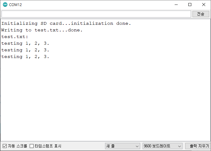 05. 프로그램을 업로드한 후 시리얼 모니터를 다시 확인한다. 카드가 올바르게 삽입되고 보드가 올바르게 배선되면 카드에 대한 정보가 표시된다.