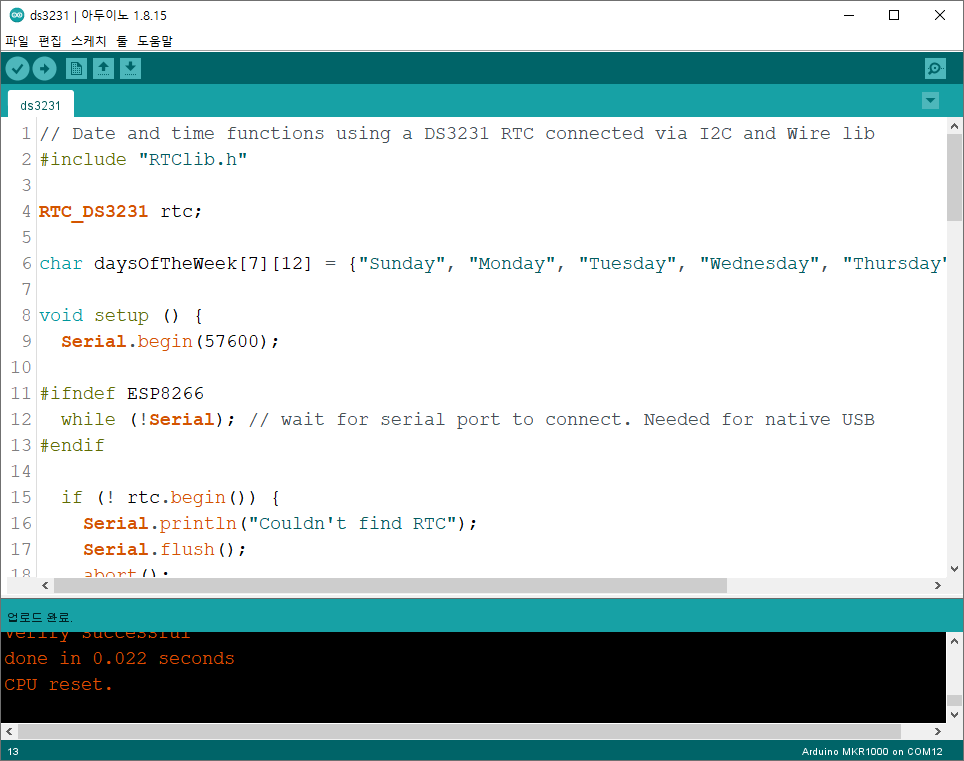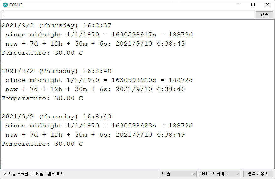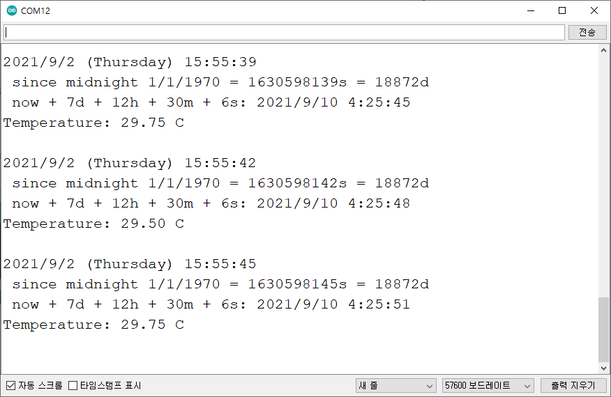 프로그램을 업로드하고 직렬 모니터를 확인하십시오. 날짜와 시간은 정확할 것이다.. (이렇게 하면 컴퓨터에서 시간이 복사되므로 컴퓨터의 시간이 올바른지 확인한다..)