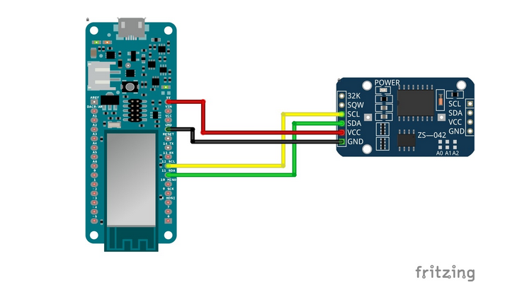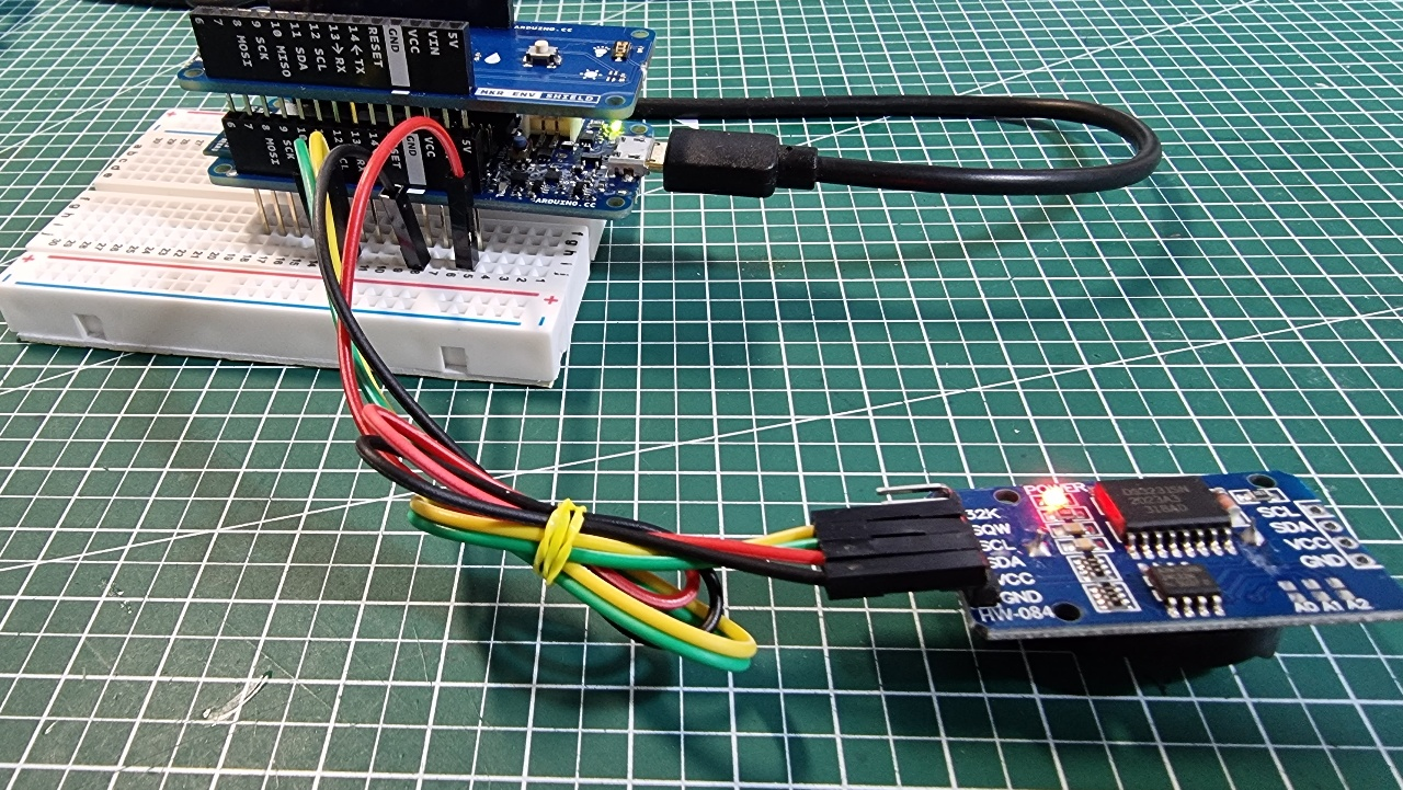 microUSB 케이블을 사용하여 Arduino MKR1000을 컴퓨터에 연결합니다. MKR1000의 녹색 "ON" 표시등과 DS3231의 빨간색 "POWER" 표시등이 모두 켜져야 한다.