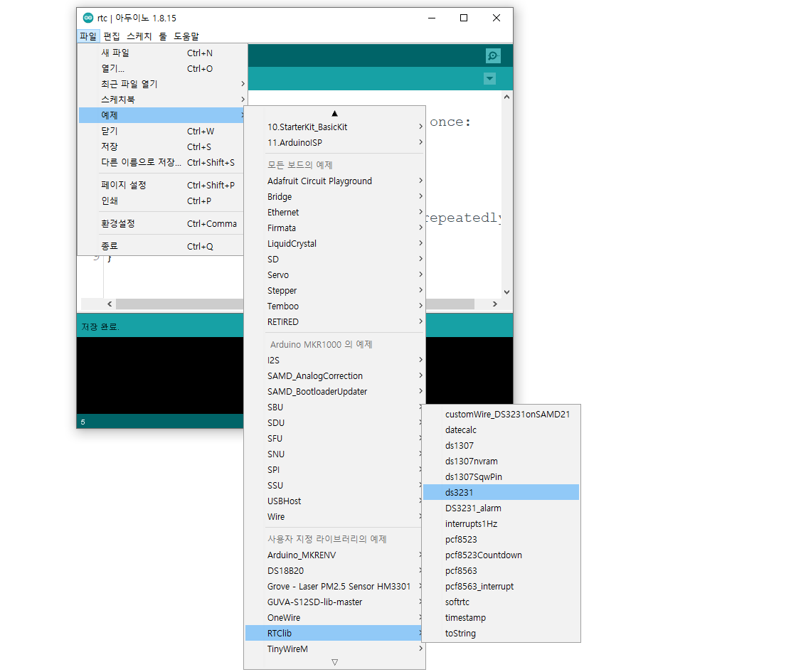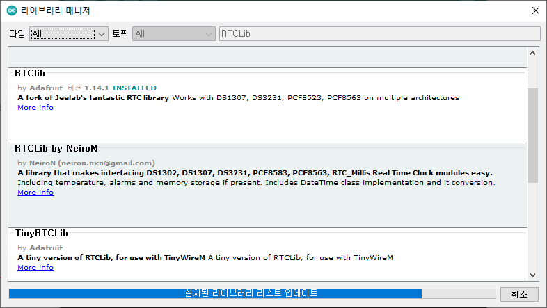 라이브러리 매니저에서 RTCLib를 검색후 , "install all" 로 라이브러리를 설치한다.
