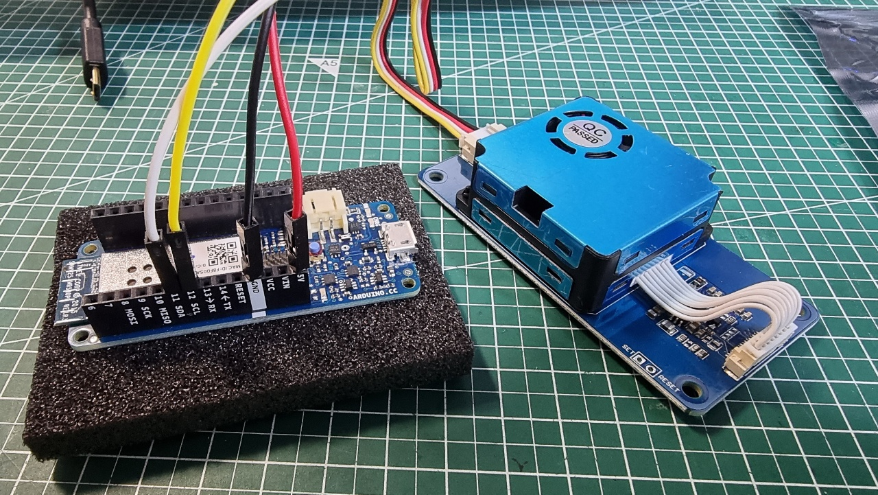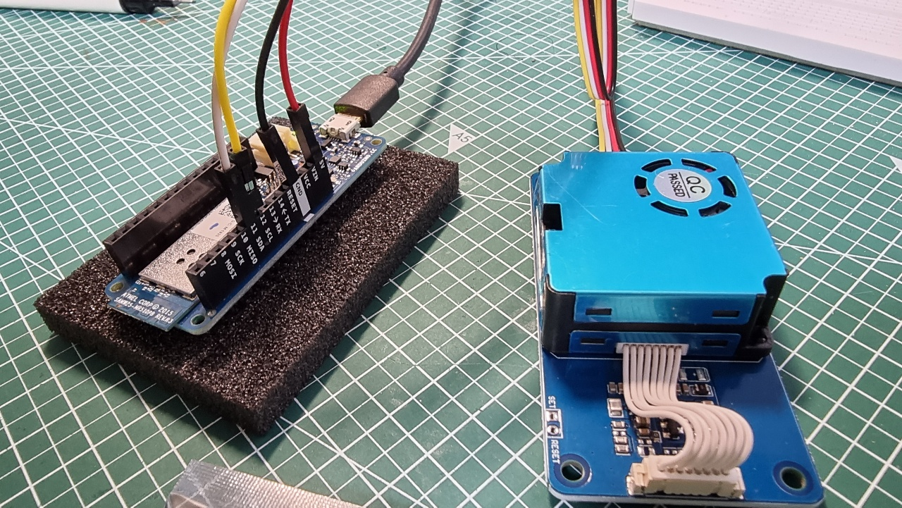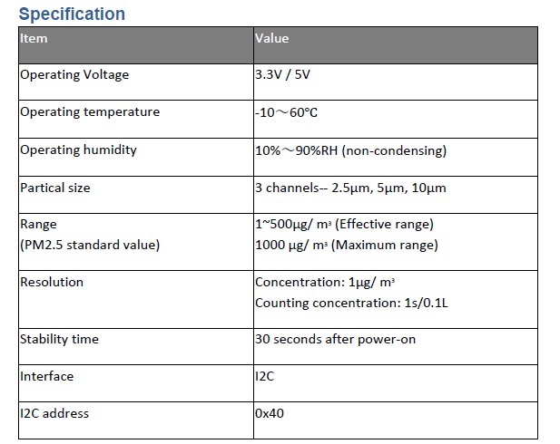 센서는 공기 중의 먼지를 실시간으로 감지한다. 이 모델은 팬을 사용하여 공기 샘플이 테스트되는 챔버로 공기를 불어넣는다. 간단한 I2C 인터페이스를 사용하여 통신한다.