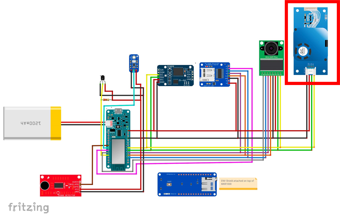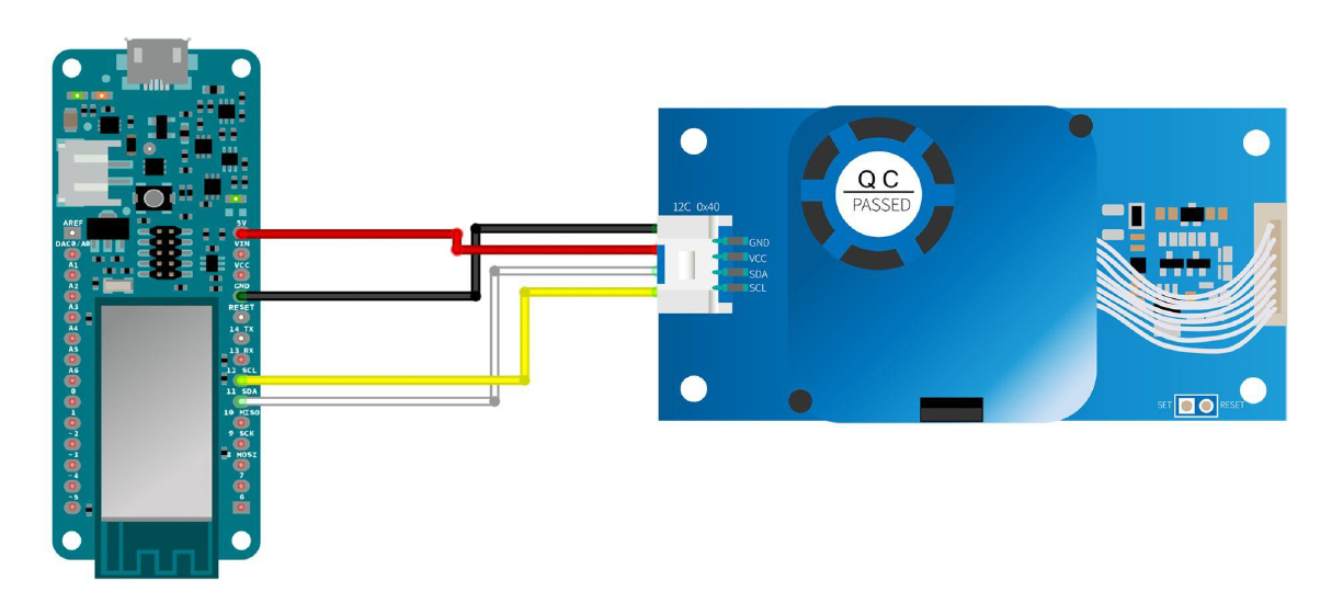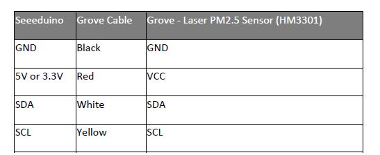 센서는 4개의 선으로 연결할 수 있다. I2C 방식으로 연결을 할 수 있다. 다음 표는 MKR1000과 레이저 PM2.5 입자 센서 사이에 연결할 핀을 보여줍니다.