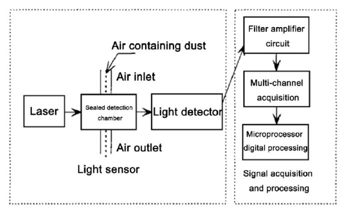 HM-3301 먼지 센서는 팬, 적외선 레이저 소스, 집광 거울, 감광관, 신호 증폭 회로 및 신호 분류 회로와 같은 주요 구성 요소로 구성된다.