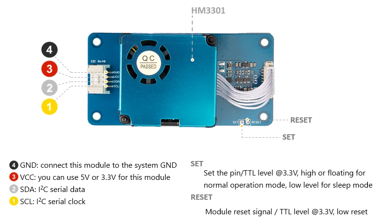 HM3301 센서의 원리는 다음과 같다. HM-3301은 펌핑 먼지 감지 센서와 달리 팬 블레이드를 사용하여 공기를 구동하고 감지 챔버를 흐르는 공기를 테스트 샘플로 사용하여 다양한 입자 크기의 먼지에 대한 실시간 연속 테스트를 수행한다.