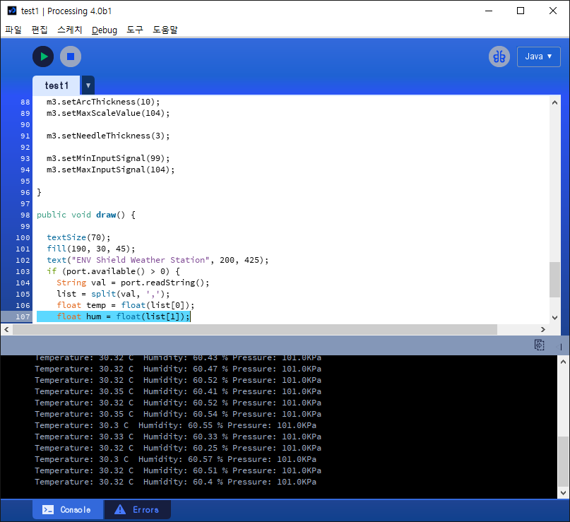 3. 실행을 선택하면 매초 업데이트되는 온도, 습도, 압력을 출력합니다.