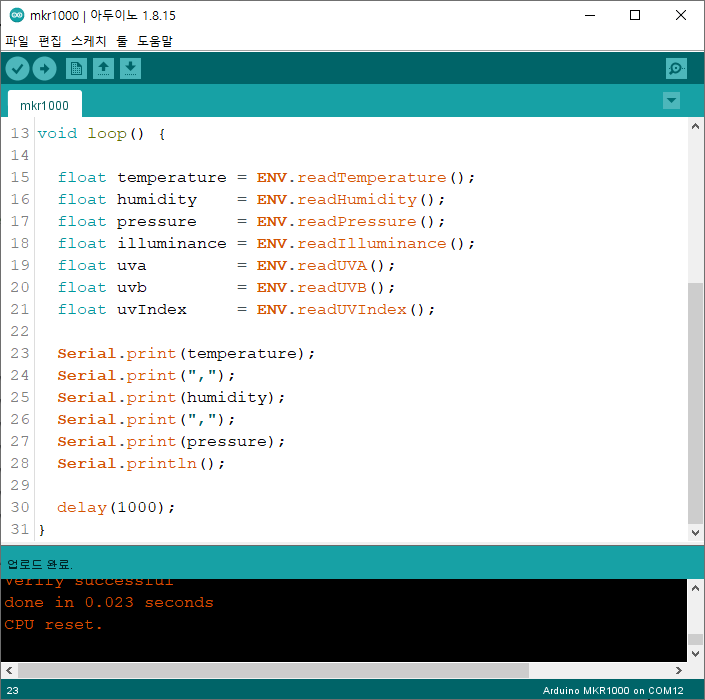 Arduino 코드는 ENV Shield 시작 가이드에 있는 샘플 코드의 축소 버전으로, 온도, 습도 및 압력만 표시하도록 변경되었습니다.