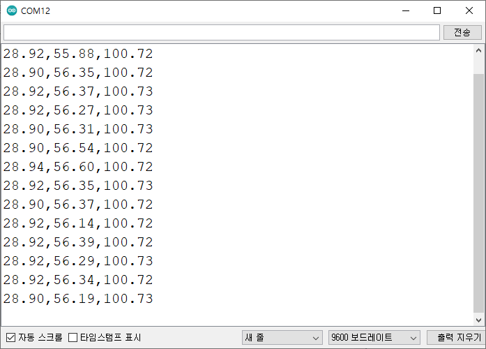 3. 코드를 업로드하고 매초 업데이트되는 온도, 습도, 압력을 목록으로 출력해야 하는 시리얼을 엽니다.